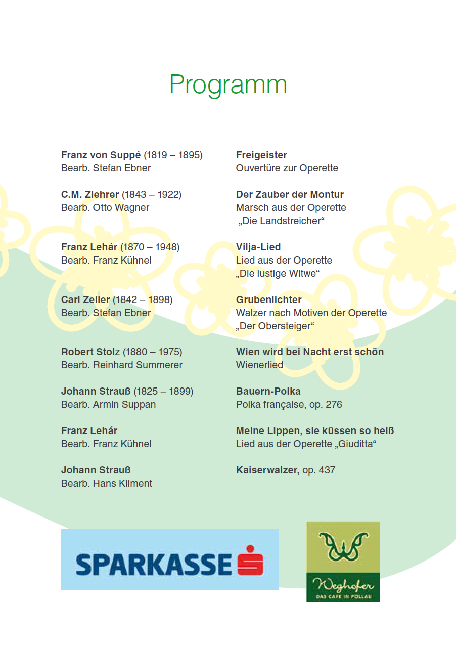 Als Solistin dürfen wir heuer Barbara Pöltl (Sopran) präsentieren. Die Musikerinnen und Musiker und Kapellmeister Rainer Pötz freuen sich bereits, Sie bei unseren Konzerten willkommen zu heißen.